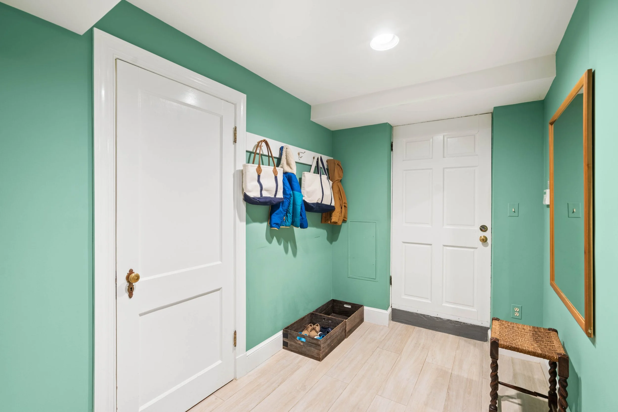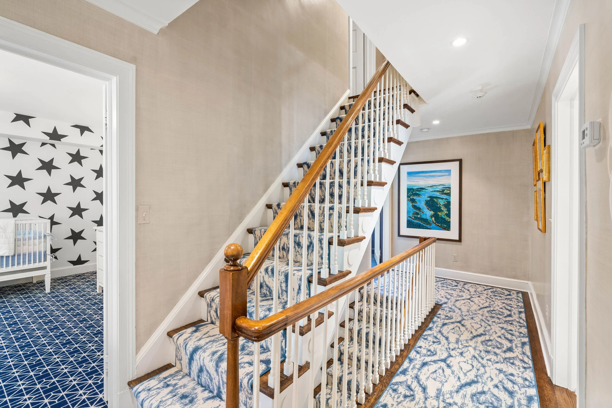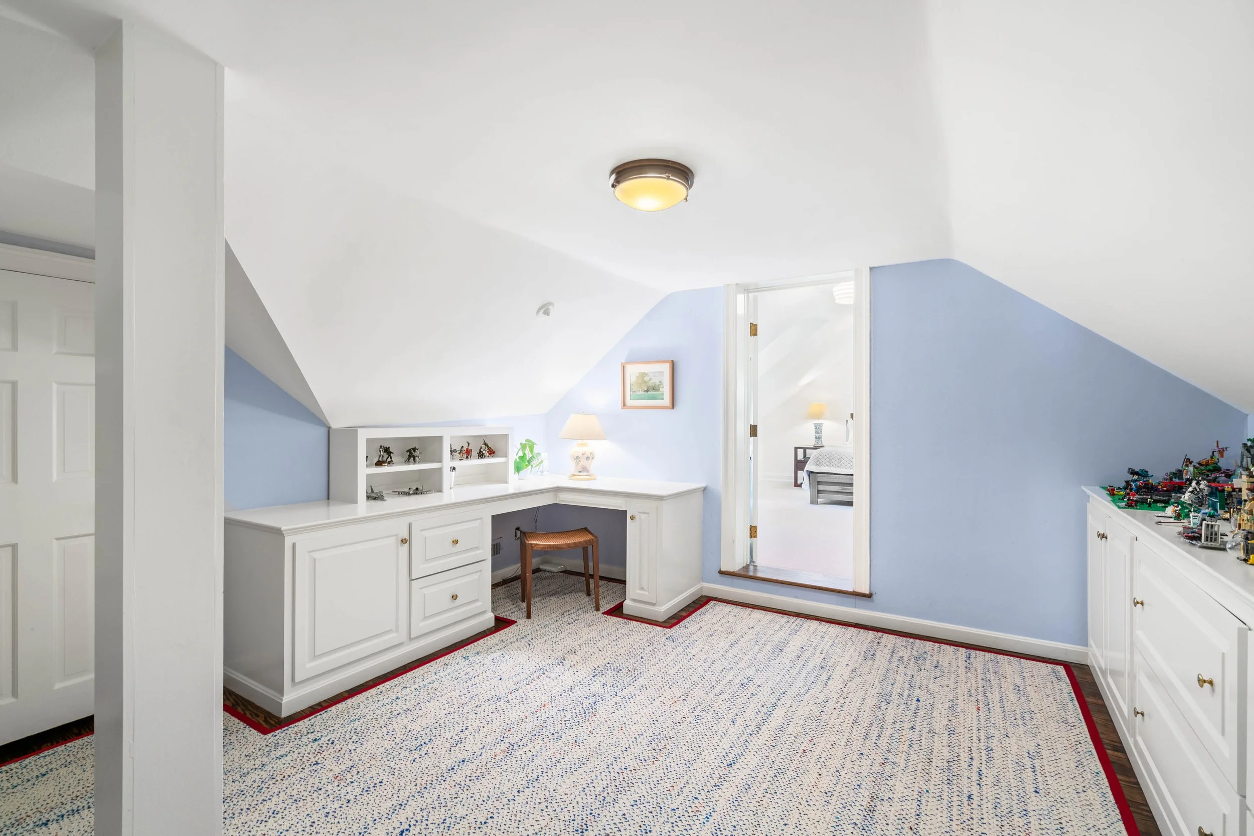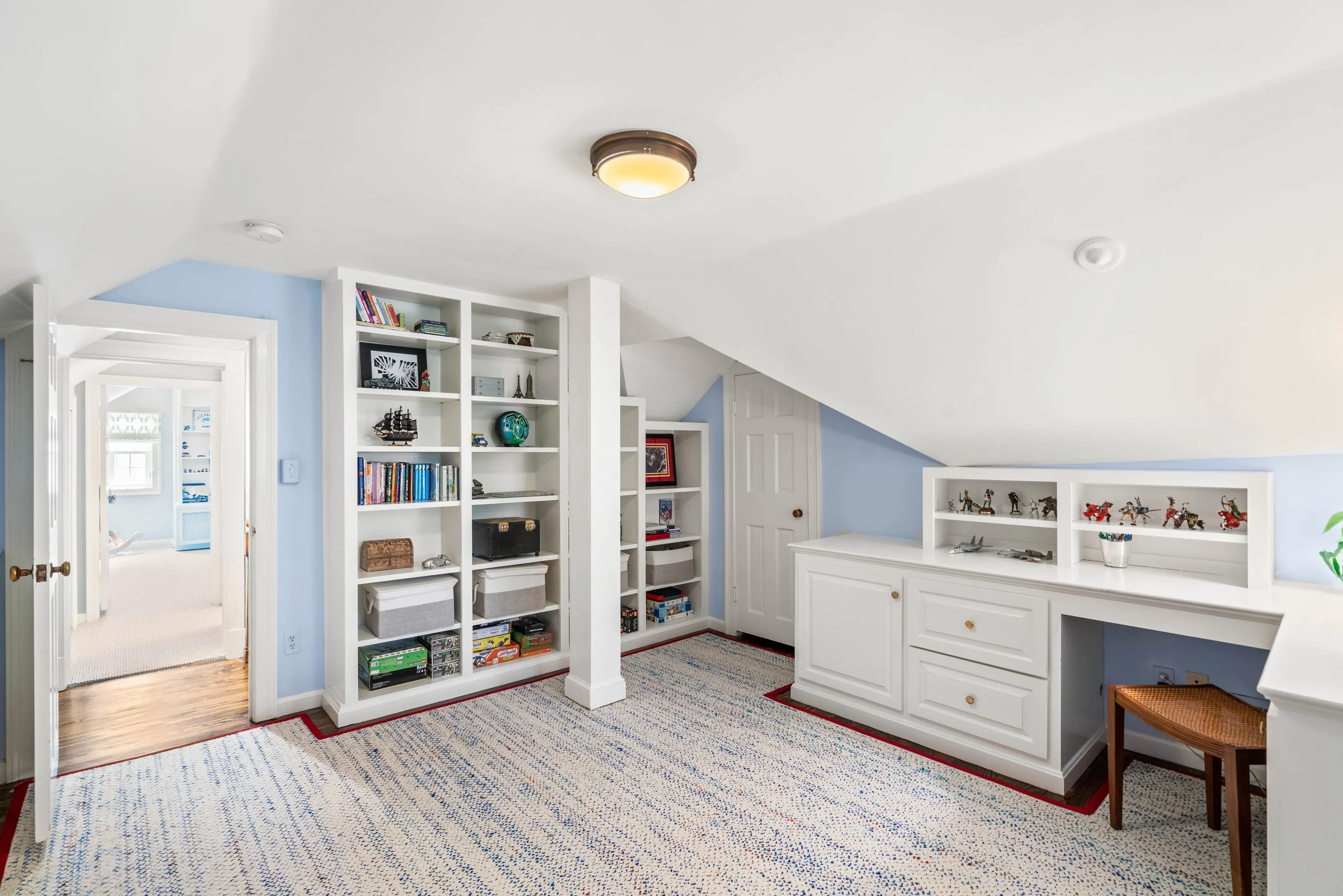 The top floor has two additional bedrooms, a sitting room, a hall bathroom, and a central office or homework room with a built-in desk and cabinets. The lower level extends the living space with a large recreation room, an impressive laundry room with additional refrigeration, and a mudroom. There is also a gym and full bathroom located on this level, as well as access to the two-car garage.