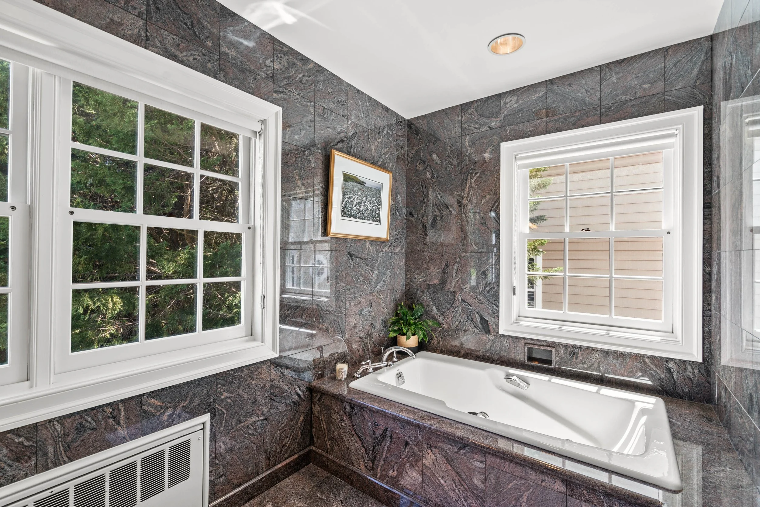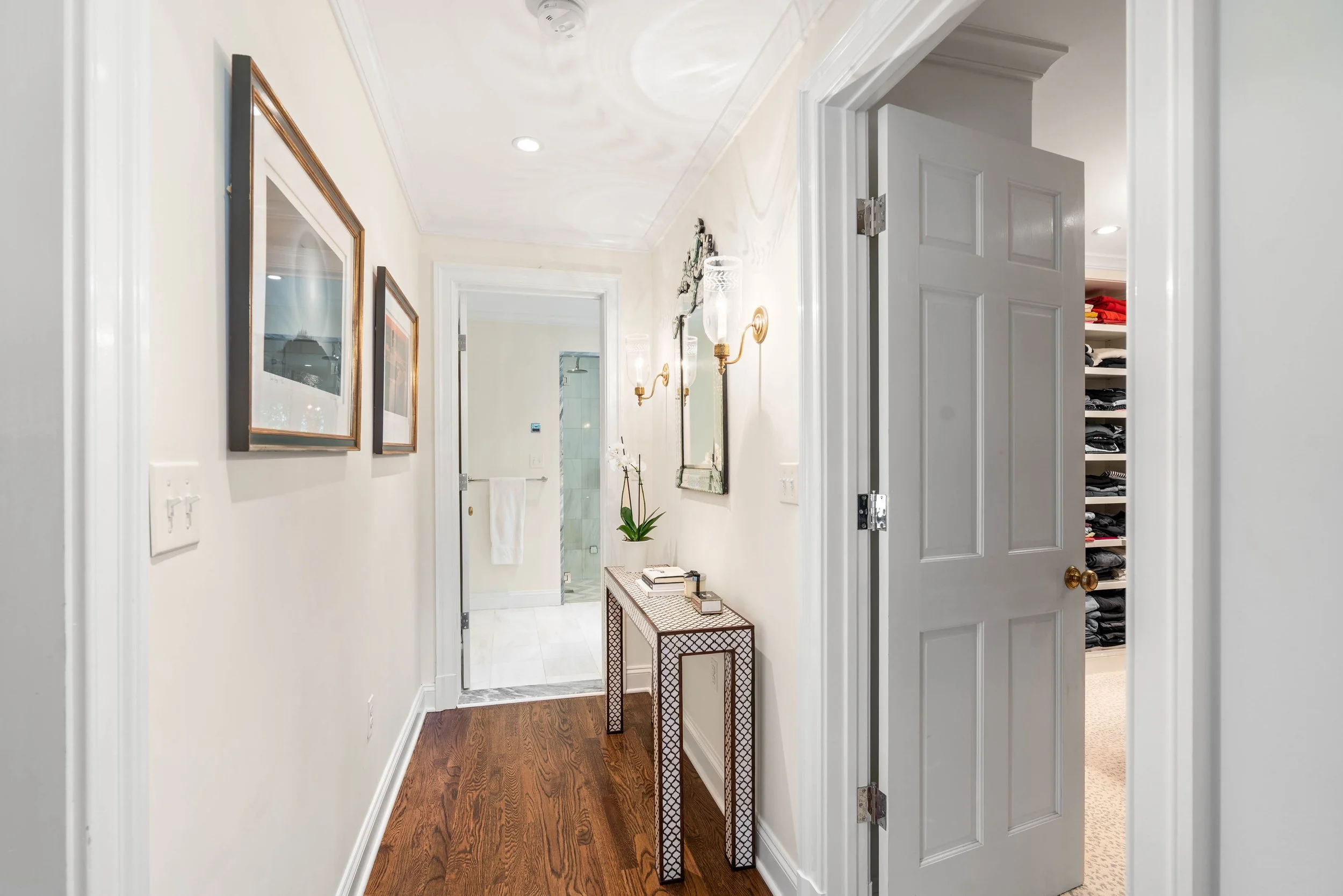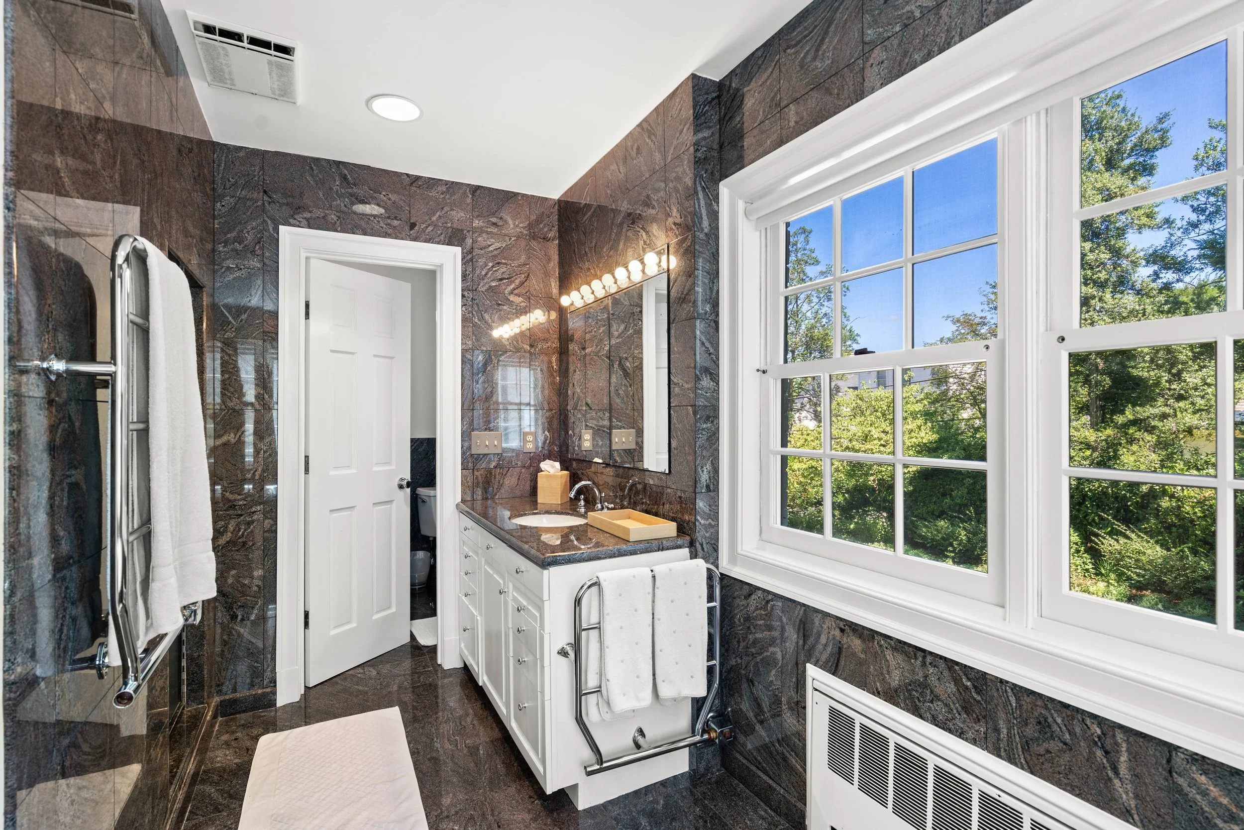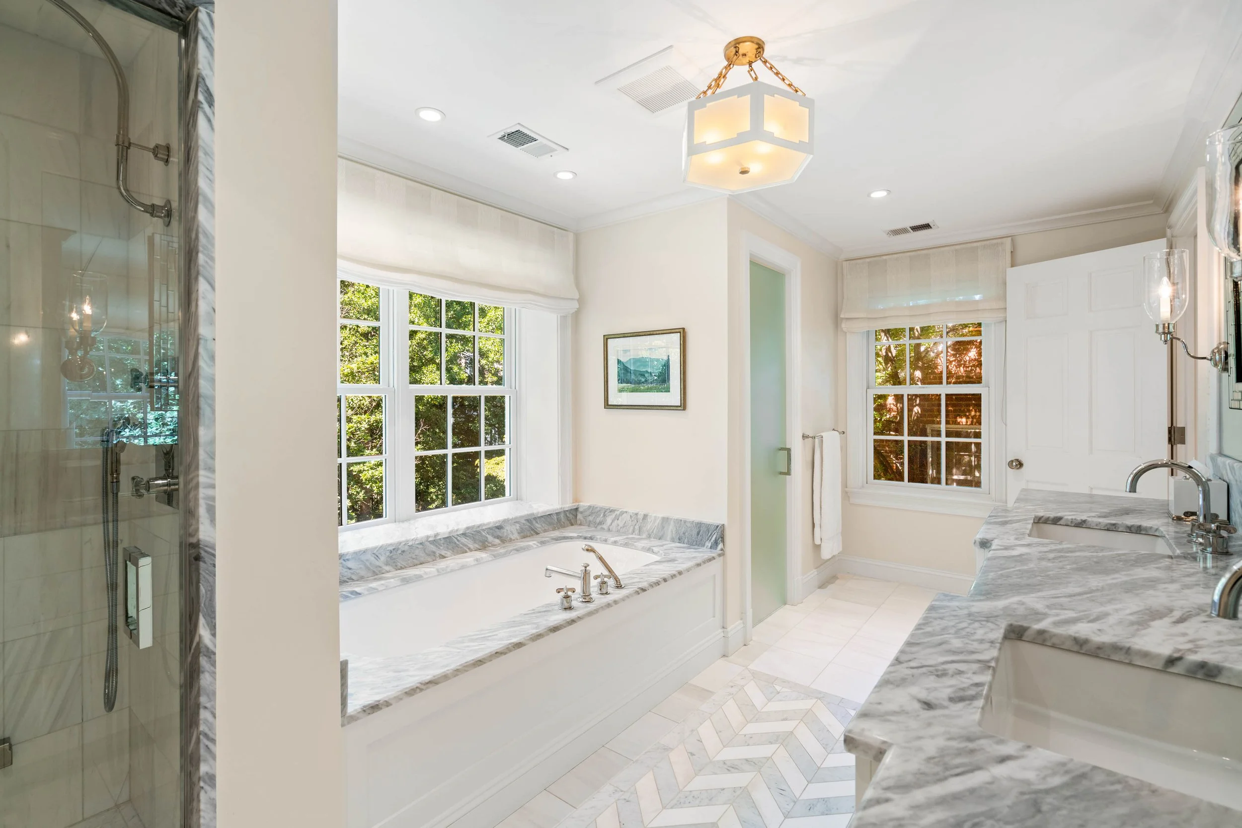 Upstairs, the second level features three bedrooms and three full bathrooms, including the luxurious primary suite. The bedroom features large windows with Honeywell automatic shades that overlooks the beautifully landscaped yard. There are two large walk-in dressing rooms and a spa-inspired marble bathroom with Waterworks fixtures, radiant heated floors, dual vanities, a spacious soaking tub, and a frameless glass steam shower. The additional bedrooms are generously sized, filled with light, and have ample closet space.