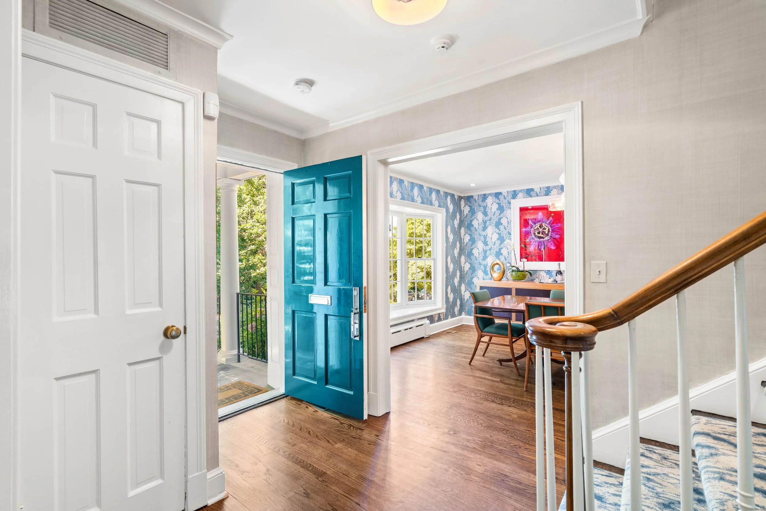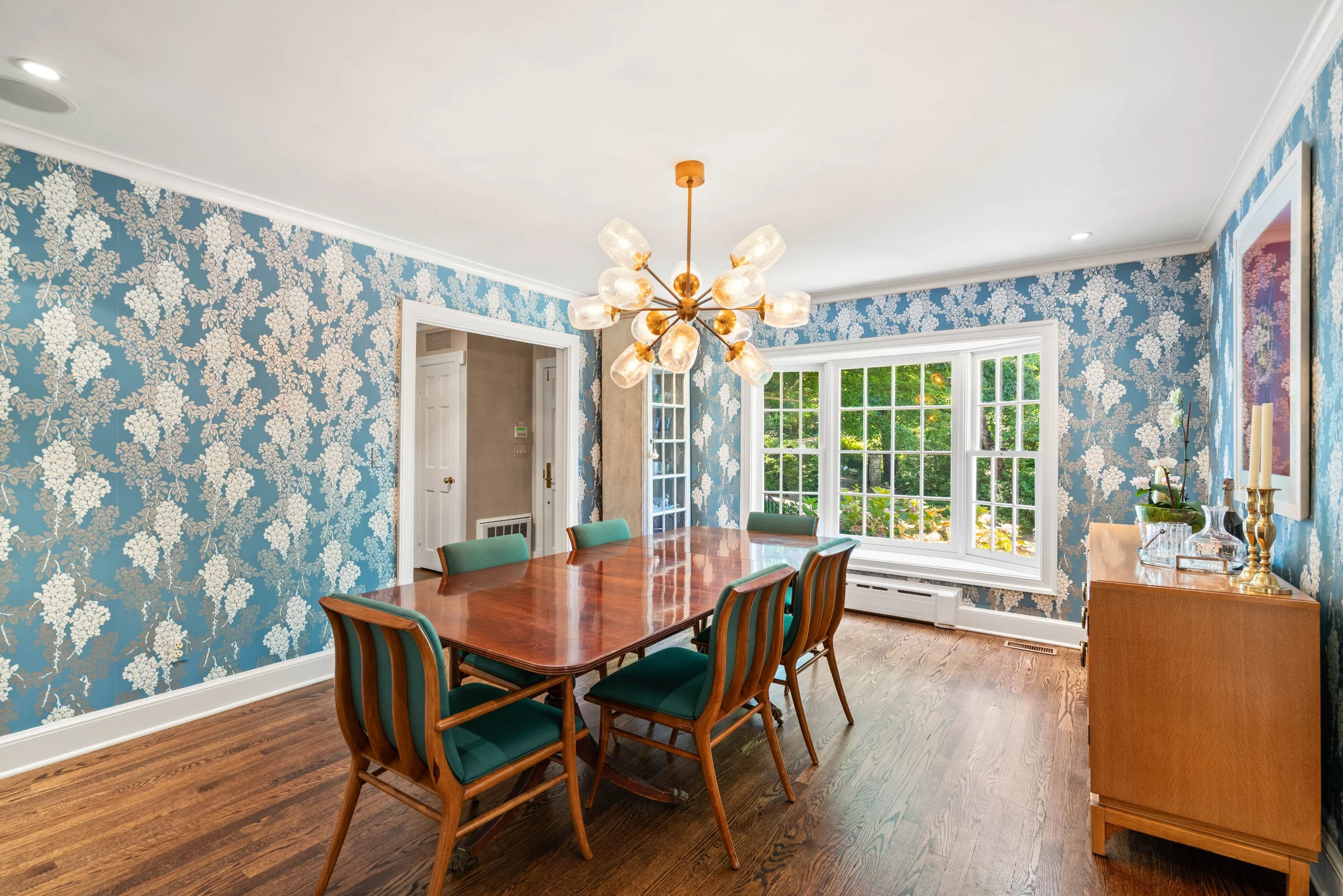The welcoming entry foyer, complete with a coat closet, seamlessly connects to the formal living and dining room. The gracious living room features built-ins and a cozy wood-burning fireplace with a stylish marble surround. Adjacent is the sophisticated dining room, highlighted by a bay window and direct access to the gourmet kitchen. The kitchen is well-appointed with a large center island, marble countertops, top-tier appliances, extensive custom cabinetry, and a separate beverage and serving area with a sink. The kitchen opens to an expansive family room, adorned with an additional fireplace, abundant built-ins, and a large media center. Dual French doors lead out to the picturesque rear terrace and garden, creating an ideal flow for indoor-outdoor living. The main floor also hosts an elegant library with a wood-burning fireplace and a convenient powder room.